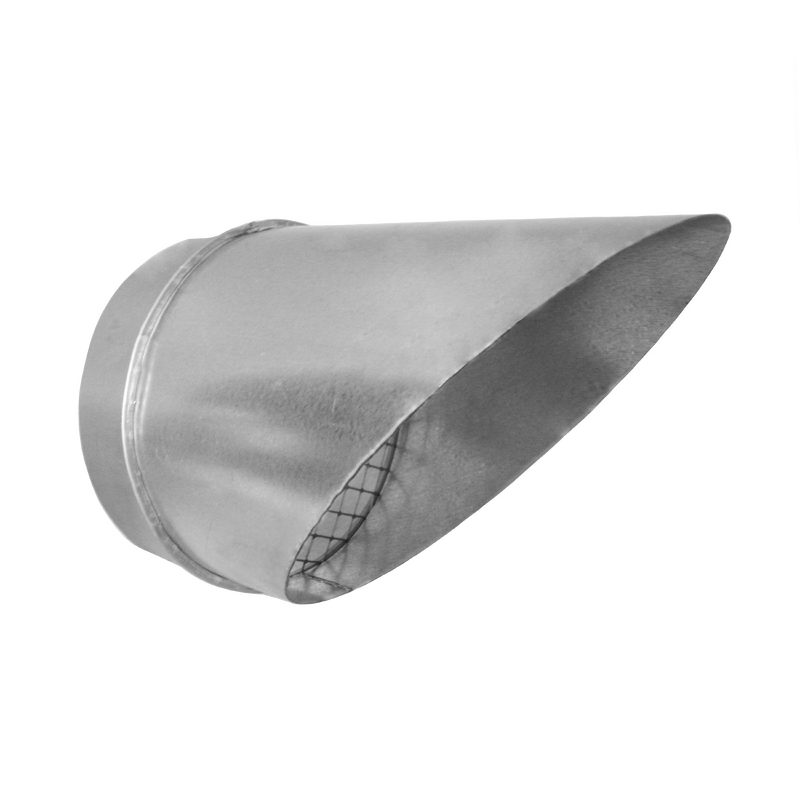 Króciec osiatkowany wykonany nyplowo z blachy ocynkowanej pasuje bezpośrednio do okrągłych rur SPIRO. Siatka zabezpieczająca na końcu króćca służy do ochrony wlotu przed dostaniem się ptaków, liści oraz większych zanieczyszczeń. Element ten stanowi najprostsze zakończenie kanału wentylacyjnego jednocześnie zapewniający minimalny opór powietrza. Skośny wykonany pod kątem 45 stopni okapnik chroni wlot przed opadami atmosferycznymi i nadaje estetyczny kształt.