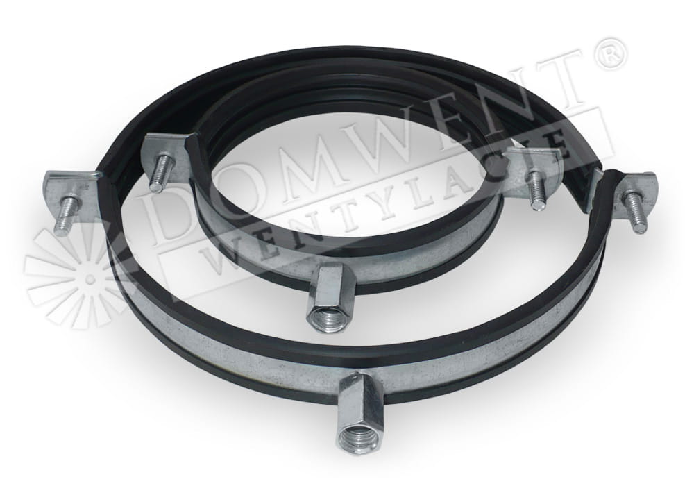 Opis: Obejma służy do mocowania, podwieszania rur typu spiro, flex, aluflex Ø160. Posiada uszczelkę gumową, która amortyzuje drgania dzięki czemu hałas nie przenosi się na konstrukcję, ścianę, sufit. Obejma posiada nakrętkę-uchwyt mocujący M8/M10 widoczny na zdjęciu. Dane techniczne: